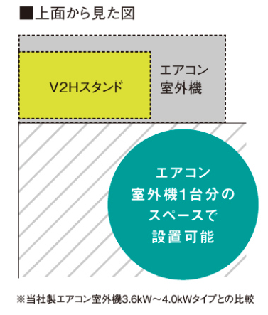 V2Hスタンドは、エアコン室外機1台分よりも小さい設置面積のコンパクト設計。限られた駐車スペースにも設置しやすいよう配慮された製品です。