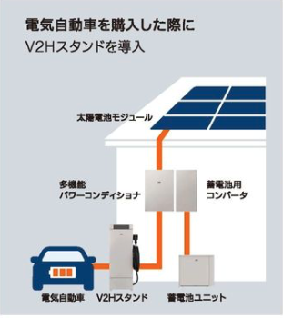 太陽光モジュール + 多機能パワーコンディショナー + 蓄電用コンバータ + 蓄電池ユニット + V2Hスタンド + 蓄電用コンバータ + 蓄電池ユニット